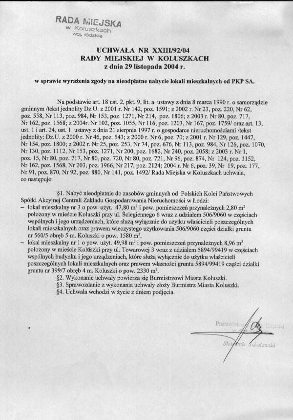 Uchwa艂a w sprawie wyra偶enia zgody na nieodp艂atne nabycie lokali mieszkalnych od PKP S.A.