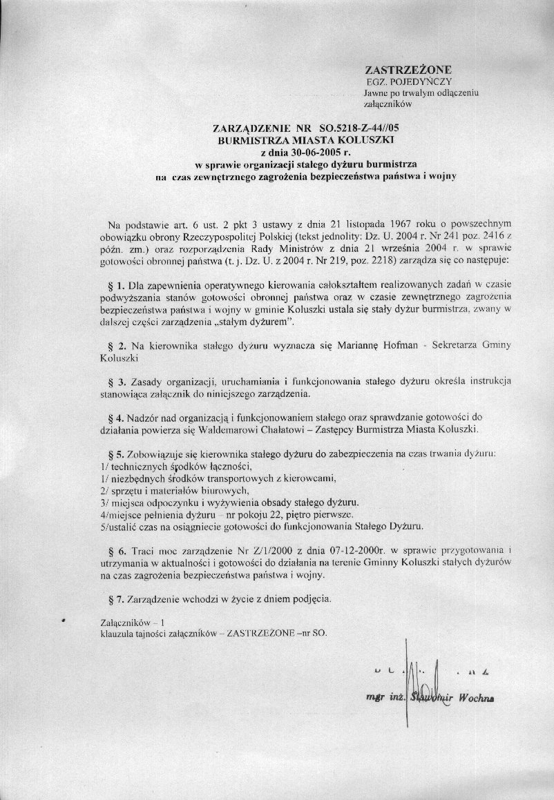 w sprawie organizacji sta艂ego dy偶uru burmistrza na czas zewn臋trznego zagro偶enia bezpiecze艅stwa pa艅stwa i wojny
