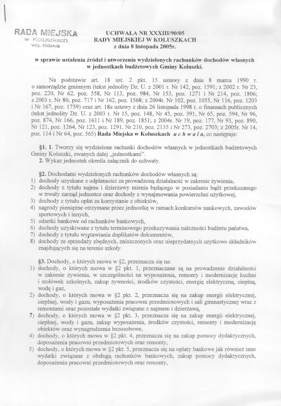 w sprawie ustalenia 藕r贸de艂 i utworzenia wydzielonych rachunk贸w dochod贸w w艂asnych w jednostkach bud偶etowych Gminy Koluszki