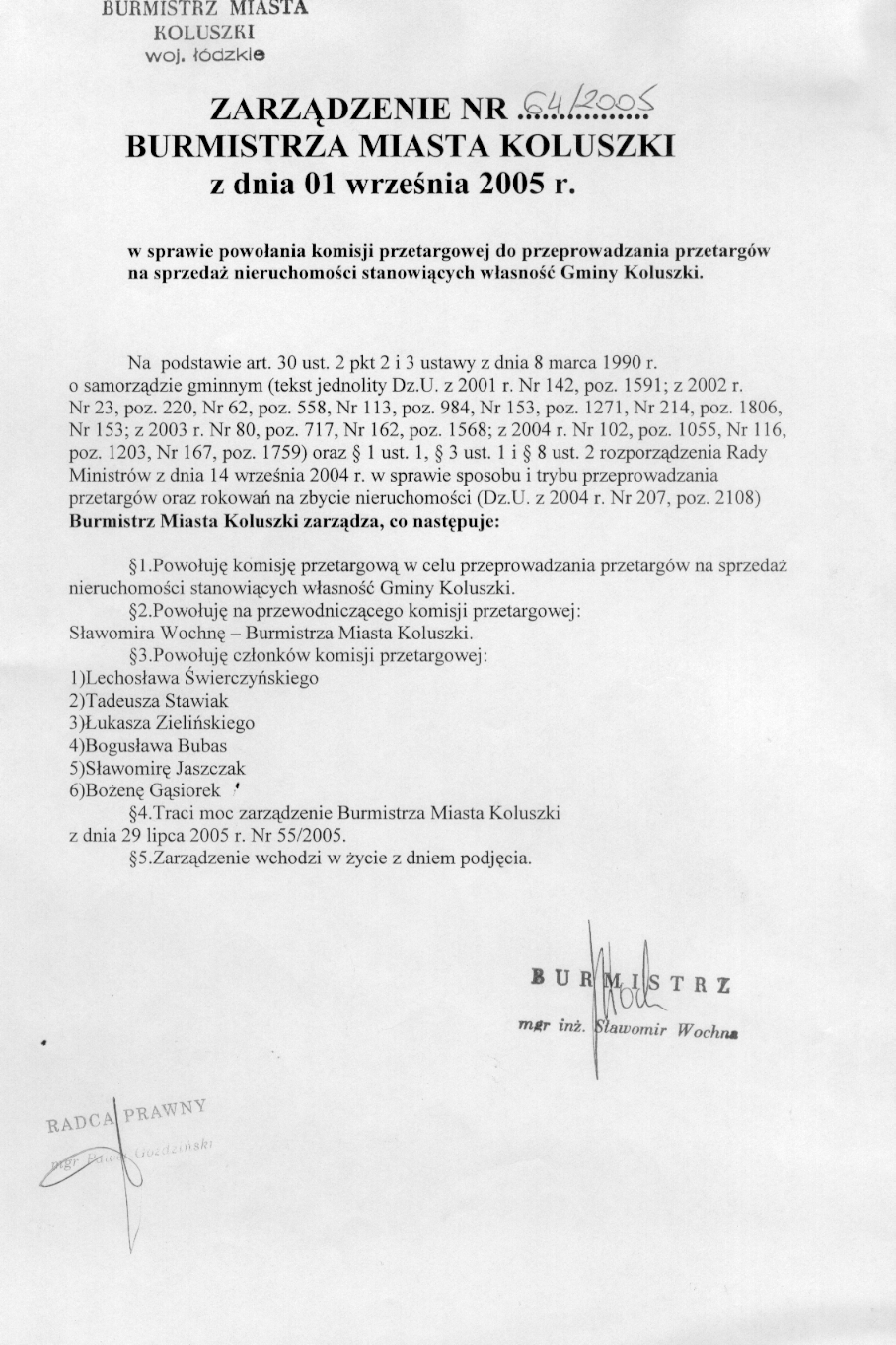 w sprawie powo艂ania komisji przetrgowej do przeprowadzania przetarg贸w na sprzeda偶 nieruchomo艣ci stanowi膮cych w艂asno艣膰 Gminy Koluszki.