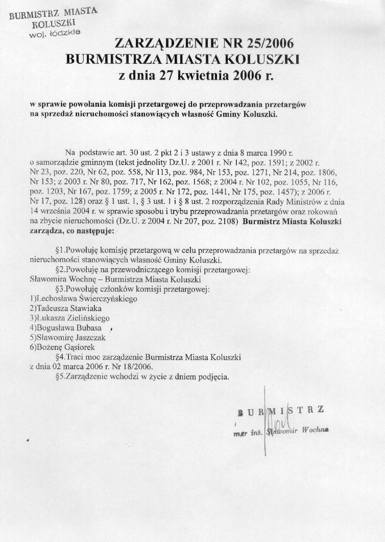 w sprawie powo艂ania komisji przetargowej do przeprowadzania przetarg贸w na sprzeda偶 nieruchomo艣ci stanowi膮cych w艂asno艣膰 Gminy Koluszki.