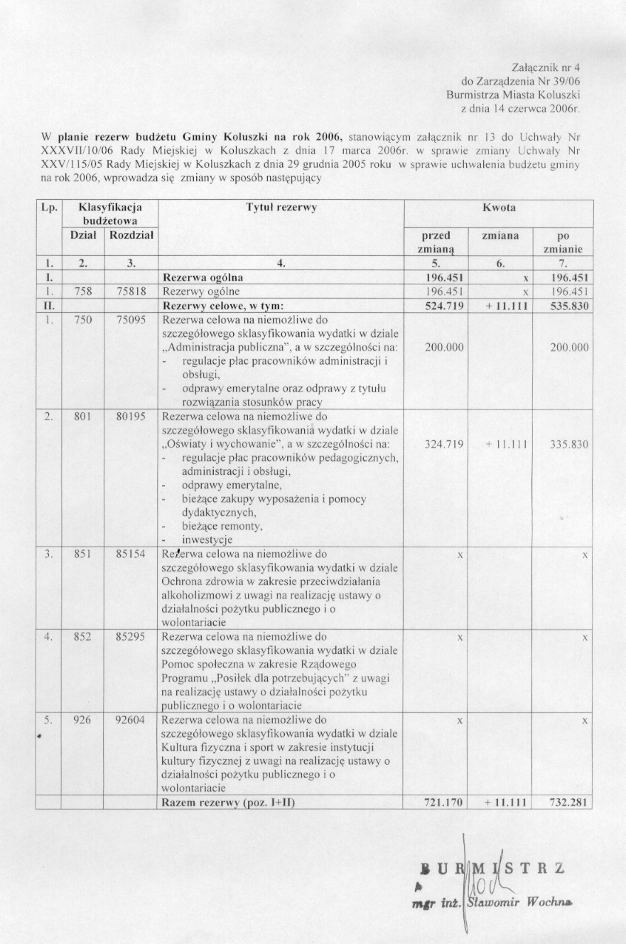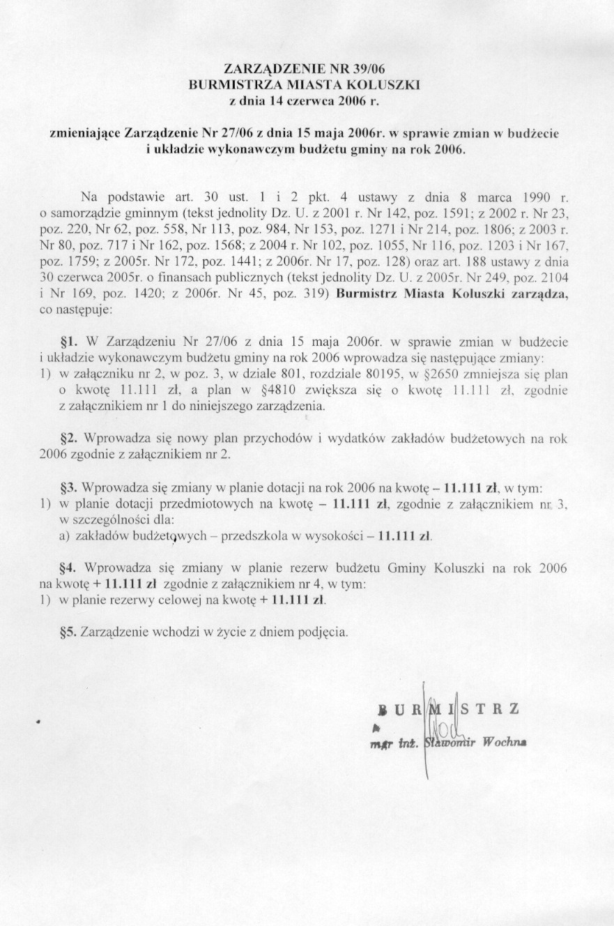 zmieniaj膮ce Zarz膮dzenie nr 27/06 z dnia 15 maja 2006 r. w sprawie zmian w bud偶ecie i uk艂adzie wykonawczym bud偶etu gminy na rok 2006.