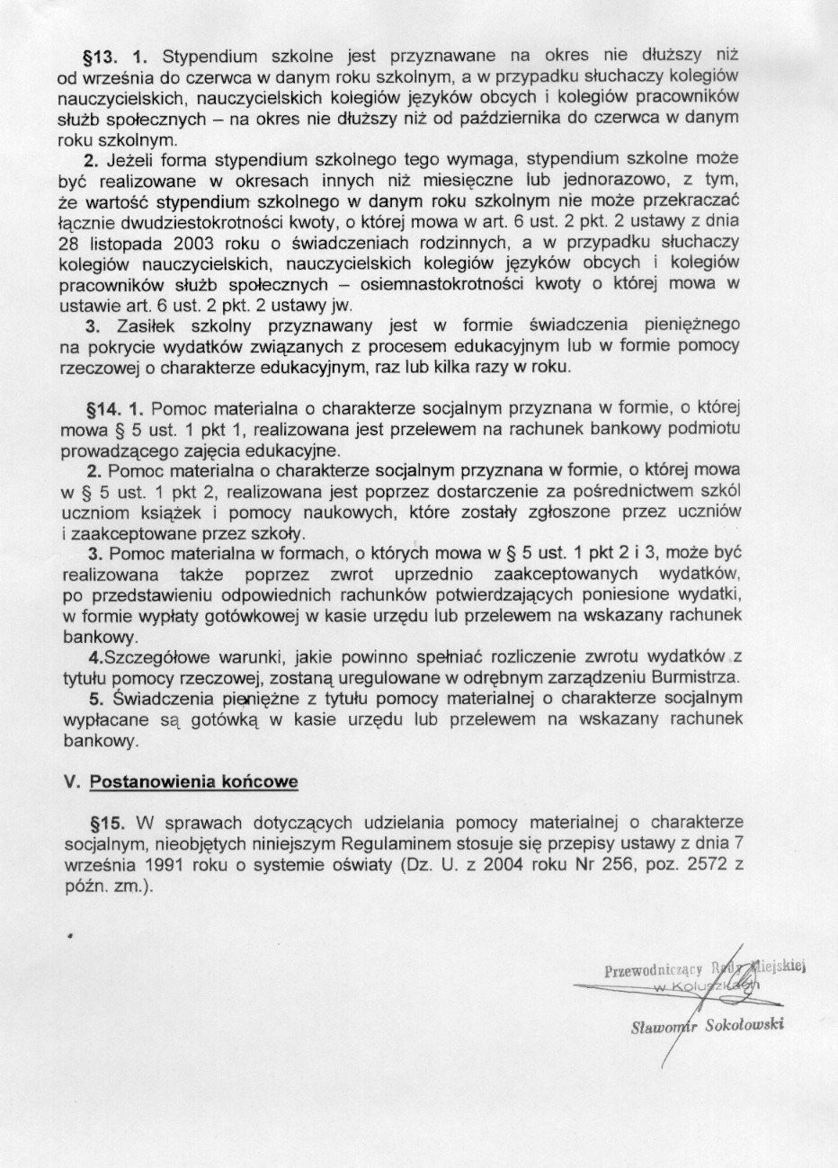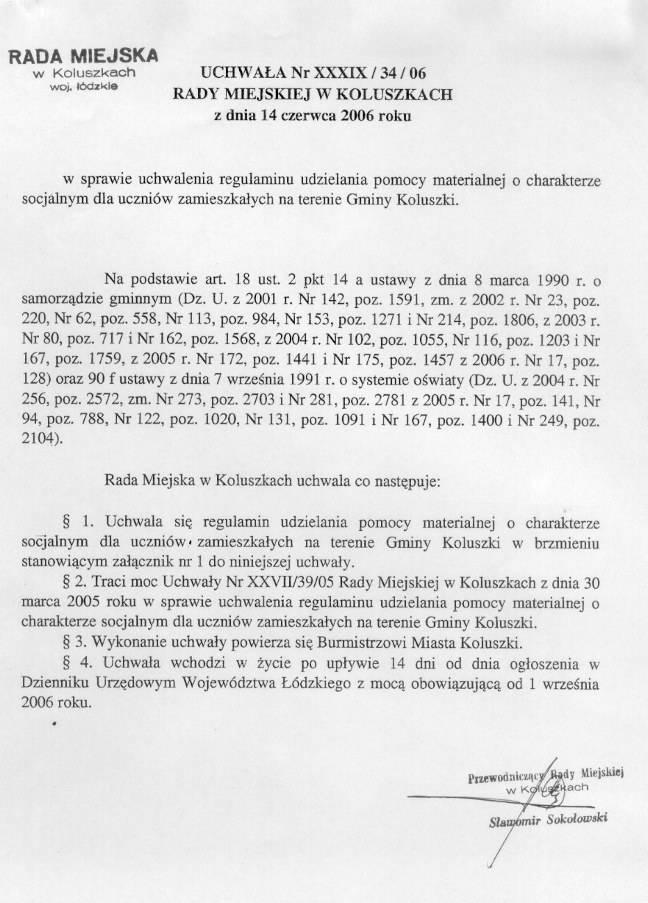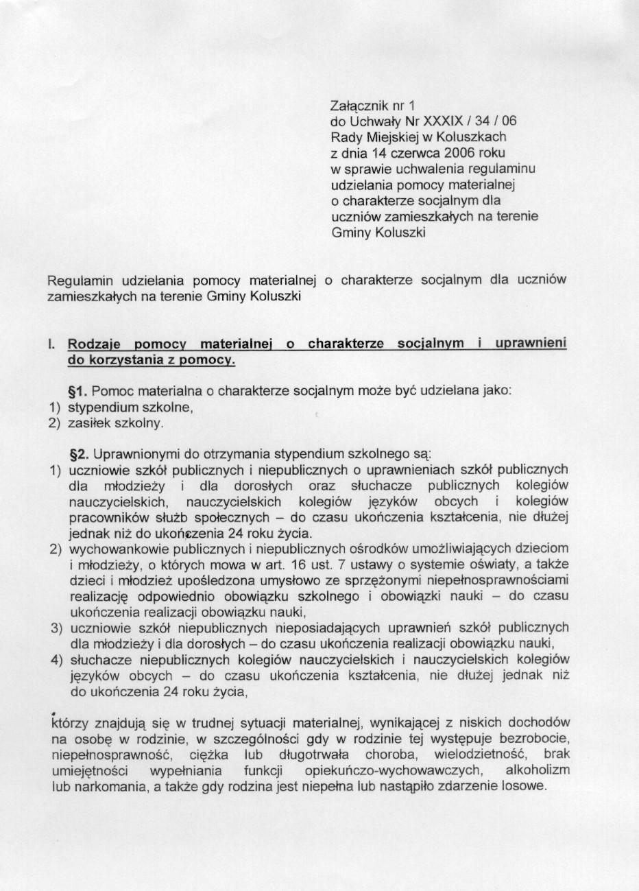 w sprawie uchwalenia regulaminu udzielania pomocy materialnej o charakterze socjalnym dla uczni贸w zamieszka艂ych na terenie Gminy Koluszki.