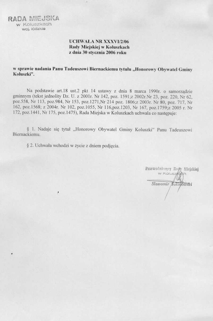 w sprawie nadania Panu Tadeuszowi Biernackiemu tytu艂u " Honorowy Obywatel Gminy Koluszki"