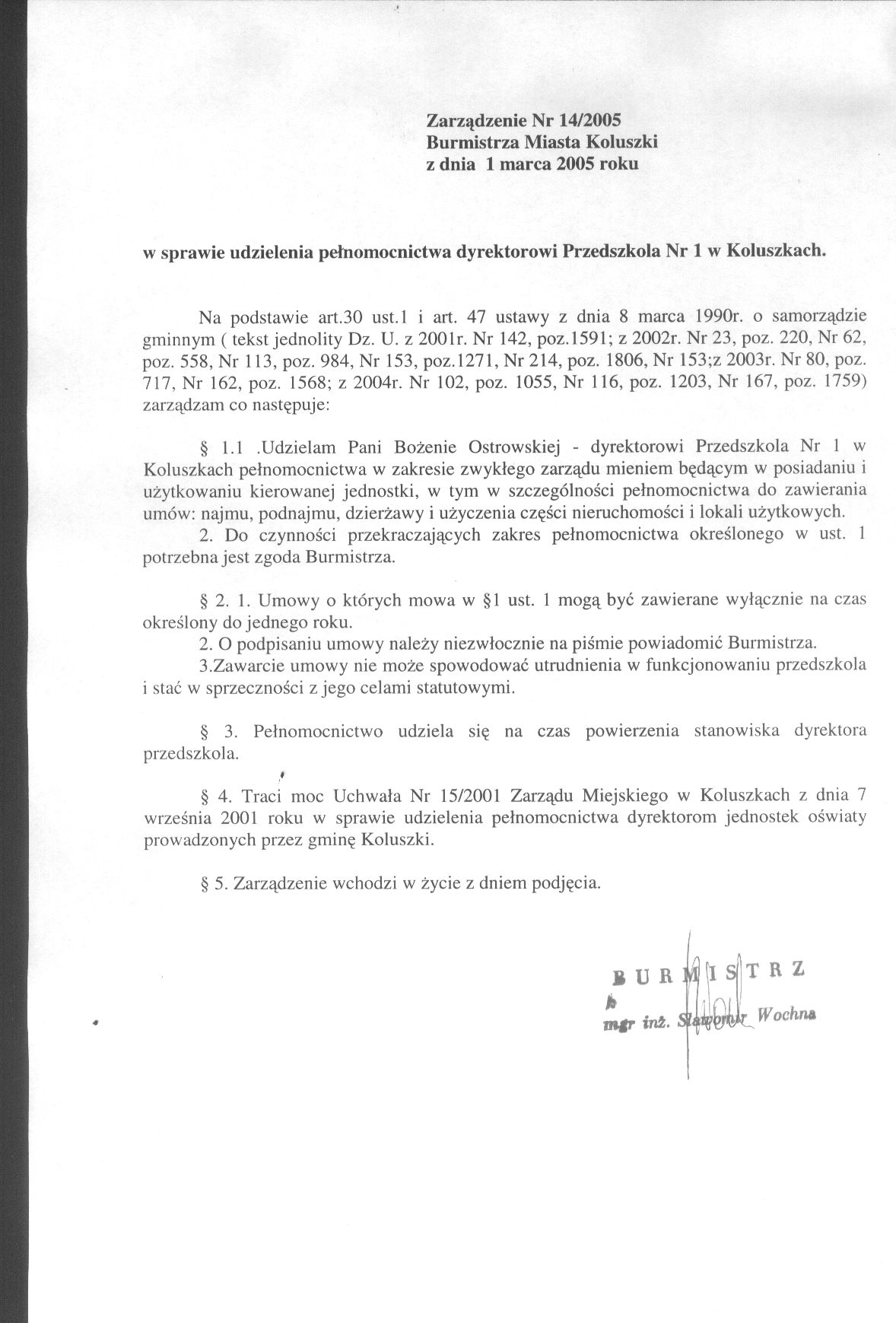 w sprawie udzielenia pe艂nomocnictwa dyrektorowi Przedszkola Nr 1 w Koluszkach
