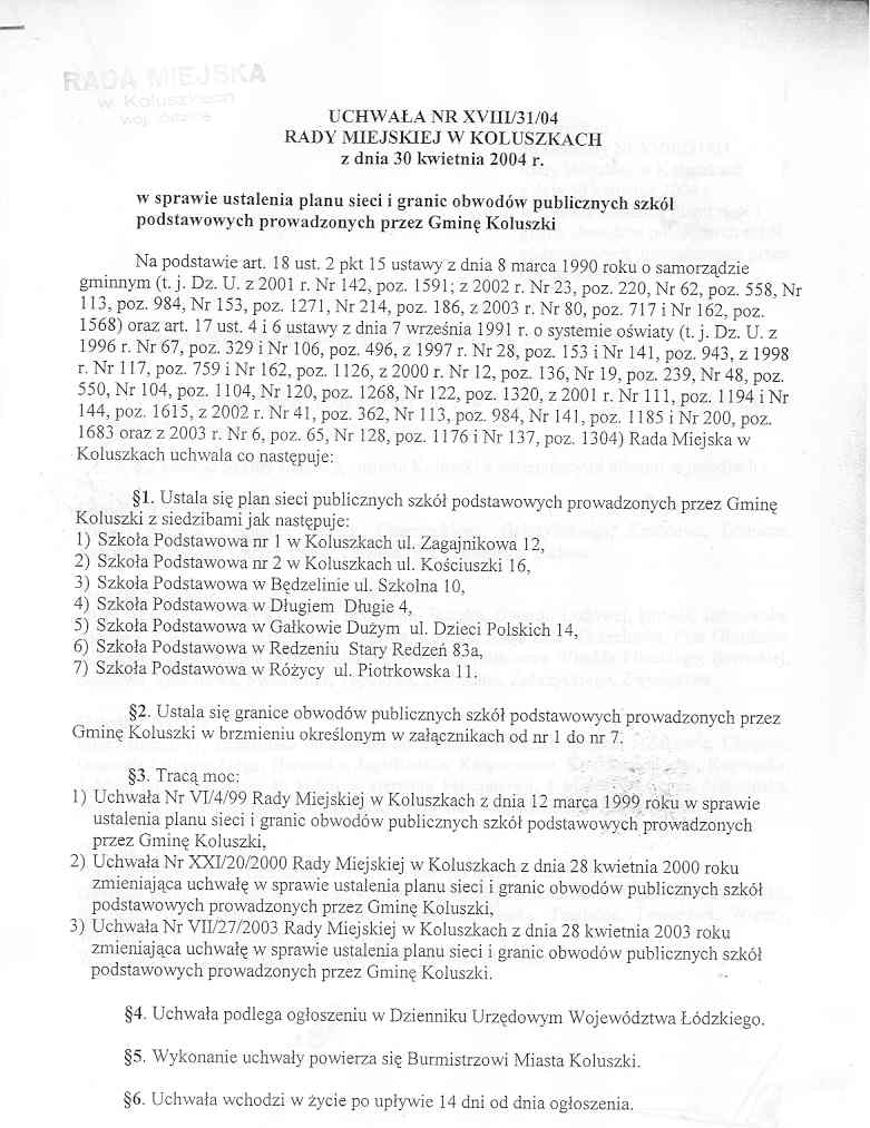 Uchwa艂a Rady Miejskiej w Koluszkach w sprawie ustalenia planu sieci i granic obwod贸w publicznych szk贸艂 podstawowych prowadzonych przez Gmin臋 Koluszki