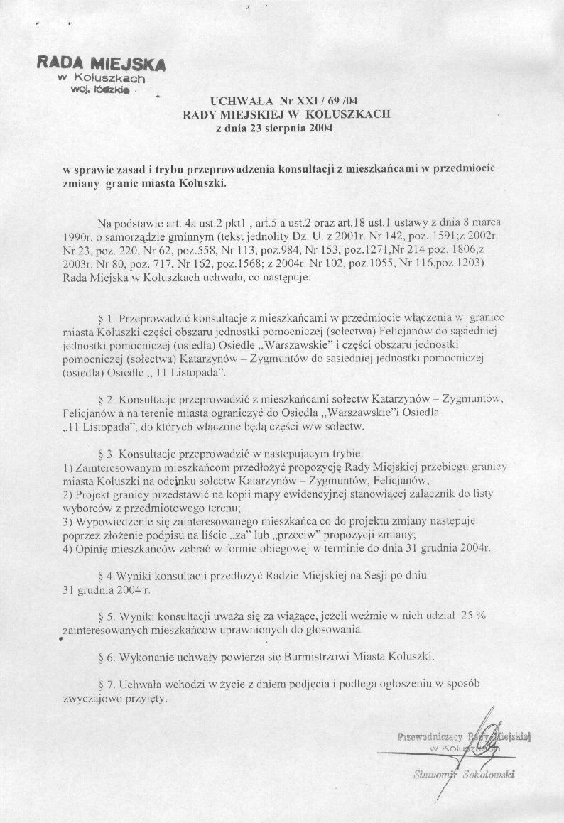 Uchwa艂a w sprawie przeprowadzenia konsultacji z mieszka艅cami w przedmiocie zmiany granic miasta Koluszki