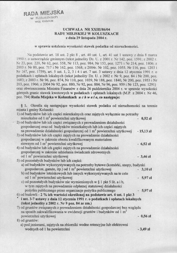 Uchwa艂a w sprawie ustalenia wysoko艣ci stawek podatku od nieruchomo艣ci.