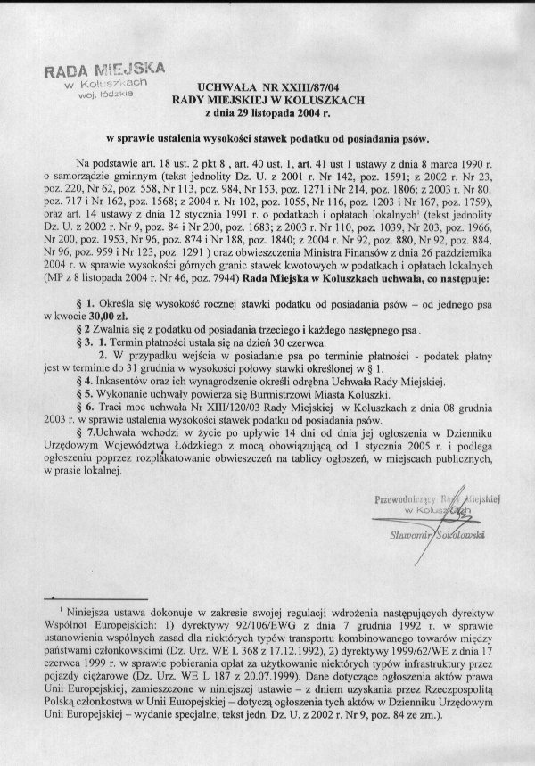 Uchwa艂a w sprawie ustalenia wysoko艣ci stawek podatku od posiadania ps贸w.