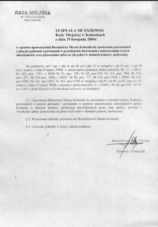Uchwa艂a w sprawie upowa偶nienia Burmistrza Miasta Koluszki do zawierania porozumie艅 z innymi gminami i powiatami w przedmiocie kierowania i umieszczania swoich mieszka艅c贸w oraz podnoszenia op艂at za ich pobyt w domach pomocy spo艂ecznej.