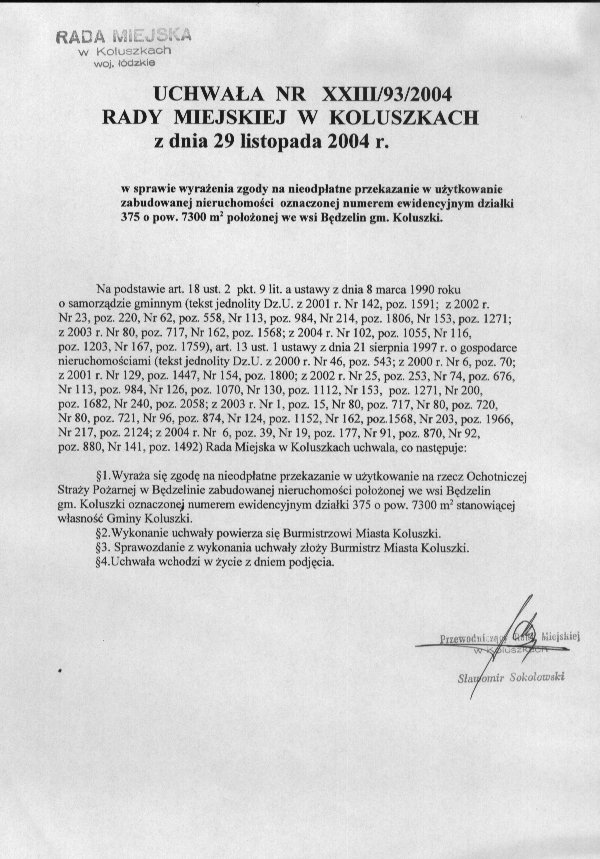 Uchwa艂a w sprawie wyra偶enia zgody na nieodp艂atne przekazanie w u偶ytkowanie zabudowanej nieruchomo艣ci oznaczonej numerem ewidencyjnym dzia艂ki 375 o pow. 7300m2 po艂o偶onej we wsi B臋dzelin gmina Koluszki.