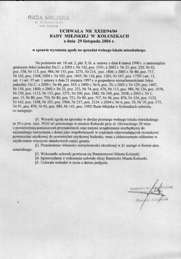 Uhwa艂a w sprawie wyra偶enia zgody na sprzeda偶 wolnego lokalu mieszkalnego po艂o偶onego w Koluszkach przy ul. G艂owackiego 20