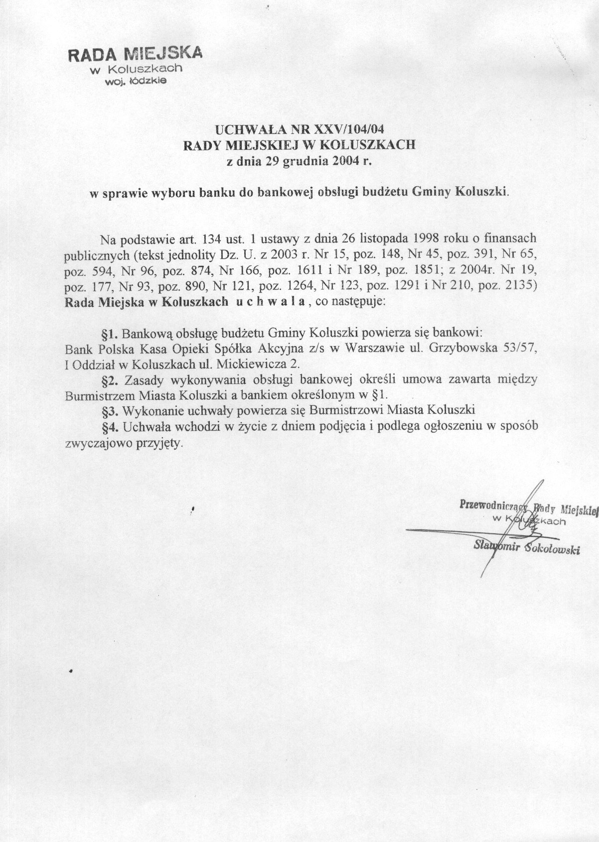 Uchwa艂a w sprawie wyboru banku do bankowej obs艂ugi bud偶etu Gminy Koluszki