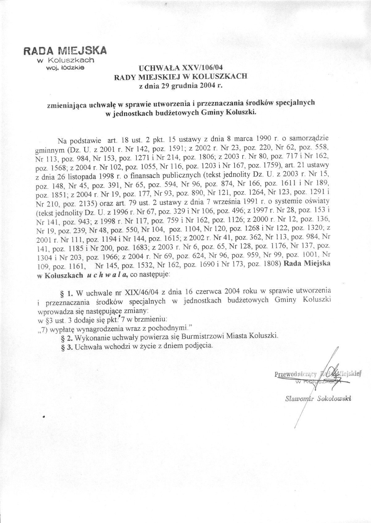 Uchwa艂a zmieniaj膮ca uchwa艂臋 w sprawie utworzenia i przeznaczenia 艣rodk贸w specjalnych w jednostkach bud偶etowych Gminy Koluszki