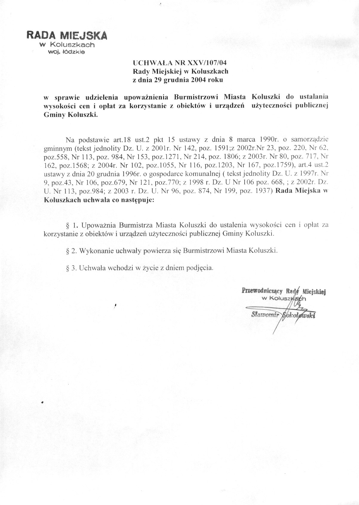 Uchwa艂a w sprawie udzielenia upowa偶nienia Burmistrzowi Miasta Koluszki do ustalania wysoko艣ci cen i op艂at za korzystanie z obiekt贸w i urz膮dze艅 u偶yteczno艣ci publicznej Gminy Koluszki