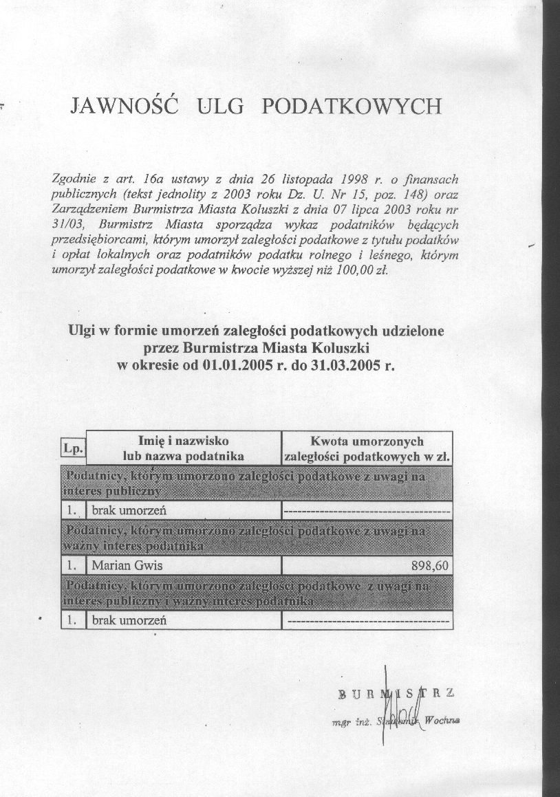 ulgi w formie umorze艅 podatkowych udzielone przez Burmistrza Miasta Koluszki w okresie od 01.01.2005r. do 31.03.2005r.