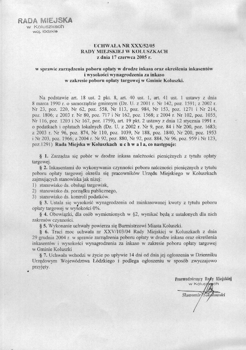 w sprawie zarz膮dzenia poboru op艂aty w drodze inkasa oraz okre艣lenia inkasent贸w i wysoko艣ci wynagrodzenia za inkaso w zakresie poboru op艂aty targowej w Gminie Koluszki