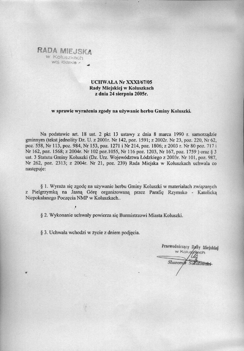 w sprawie wyra偶enia zgody na u偶ywanie herbu Gminy Koluszki