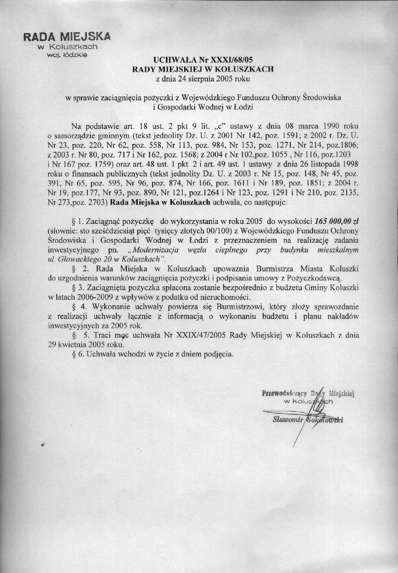 w sprawie zaci膮gni臋cia po偶yczki z Wojew贸dzkiego Funduszu Ochrony rodowiska i Gospodarki Wodnej w odzi z przeznaczeniem na realizacj臋 zadania inwestycyjnego pn. "Modernizacja w臋z艂a cieplnego przy budynku mieszkalnym ul. G艂owackiego 20 w Koluszkach"