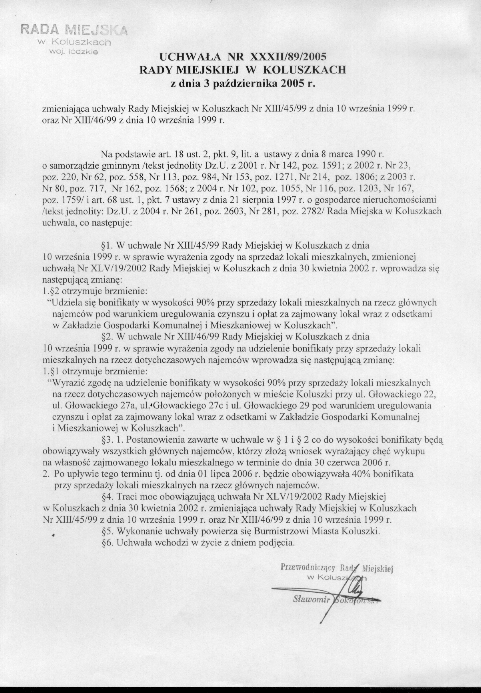 zmieniaj膮ca uchwa艂y Rady Miejskiej w Koluszkach Nr XIII/45/99 z dnia 10 wrze艣nia 1999 r. oraz Nr XIII/46/99 z dnia 10 wrzw艣nia 1999 r.