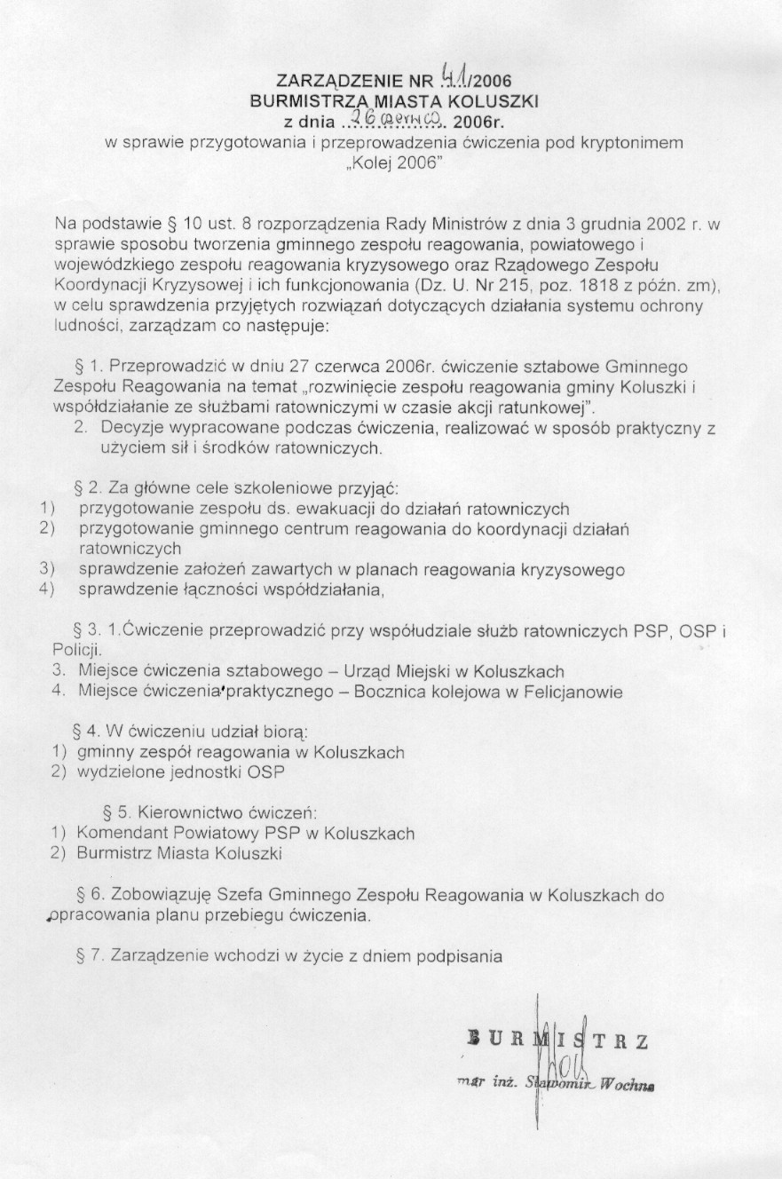 w sprawie przygotowania i przeprowadzenia 膰wiczenia pod kryptonimem "Kolej 2006"