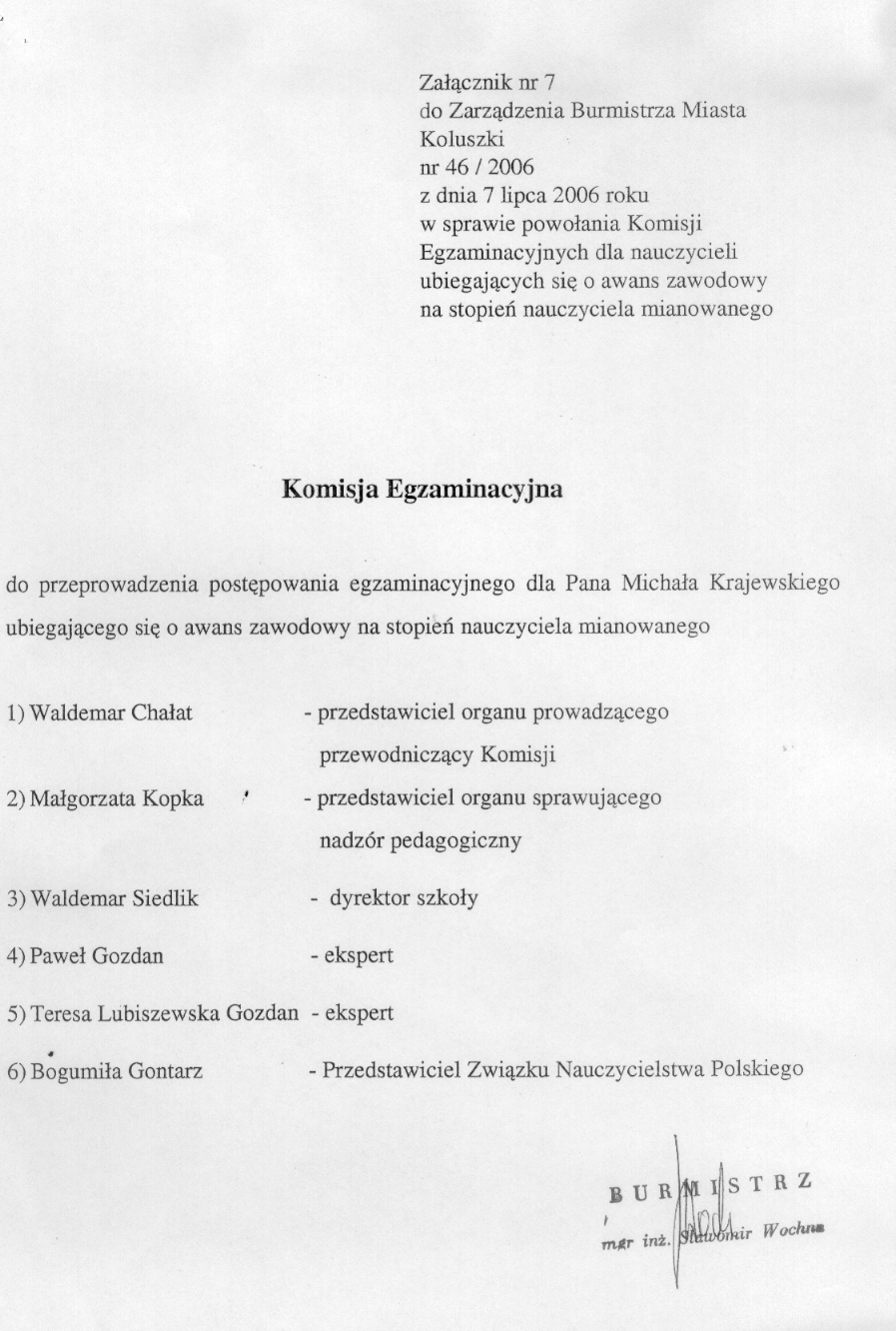 w sprawie powo艂ania Komisji Egzaminacyjnych dla nauczycieli ubiegaj膮cych si臋 o awans zawodowy na stopie艅 nauczyciela mianowanego.