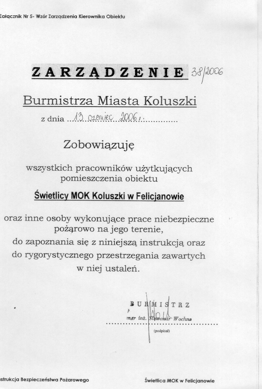 zobowi膮zanie dla wszystkich pracownik贸w u偶ytkuj膮cych pomieszczenia obiektu 艢wietlicy MOK Koluszki w Felicjanowie.