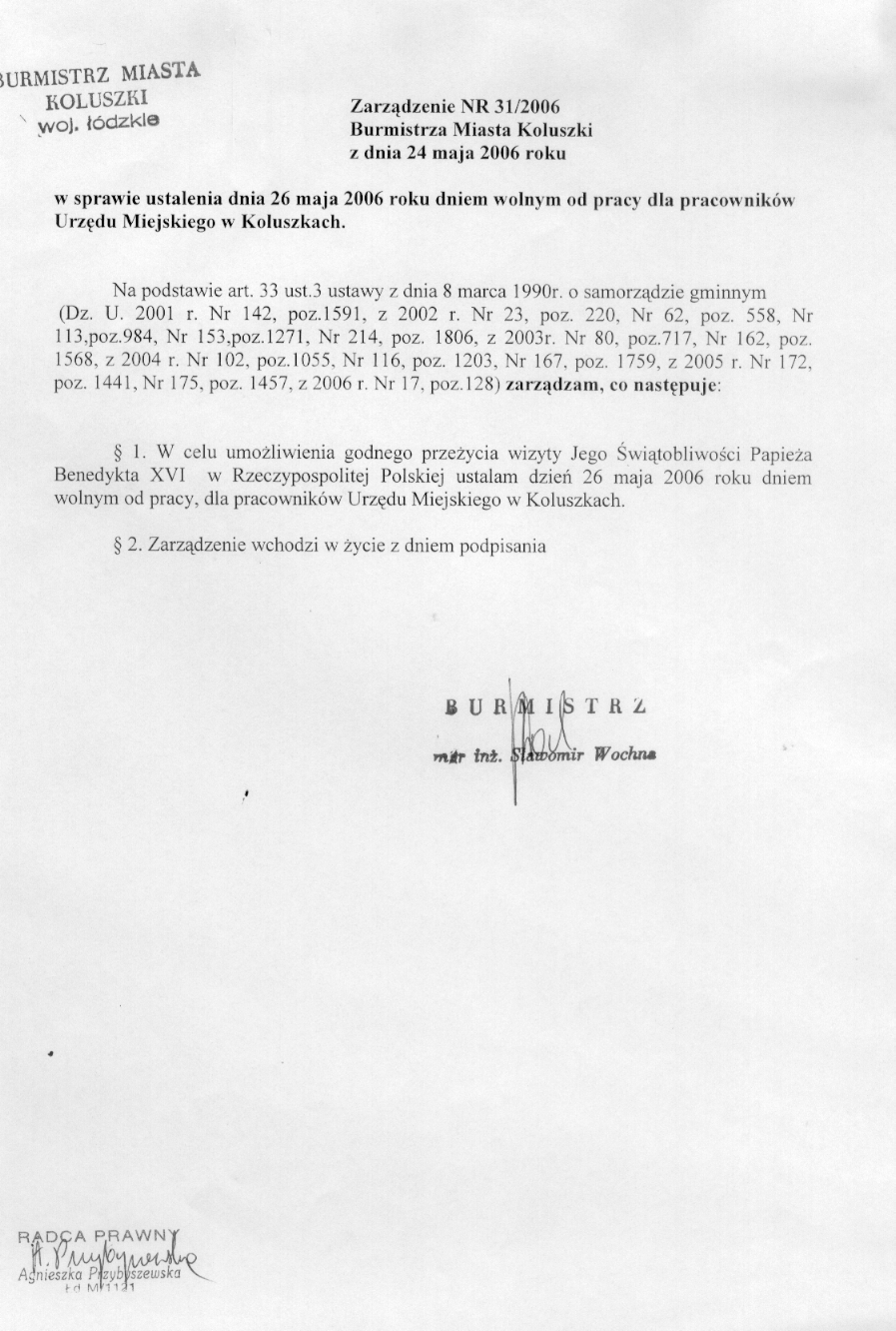 w sprawie ustalenia dnia 26 maja 2006 roku dniem wolnym od pracy dla pracownik贸w Urz臋du Miejskiego w Koluszkach.