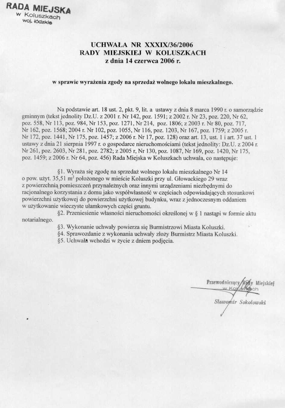 w sprawie wyra偶enia zgody na sprzeda偶 wolnego lokalu mieszkalnego.
