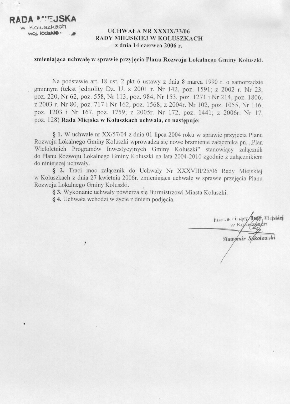 zmieniaj膮ca uchwa艂e w sprawie przyj臋cia Planu Rozwoju Lokalnego Gminy Koluszki.