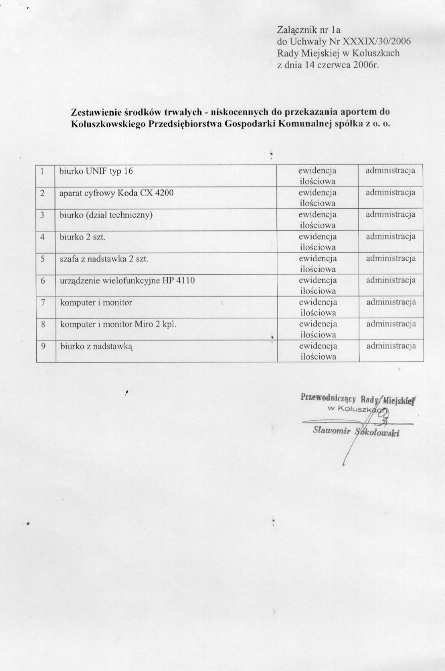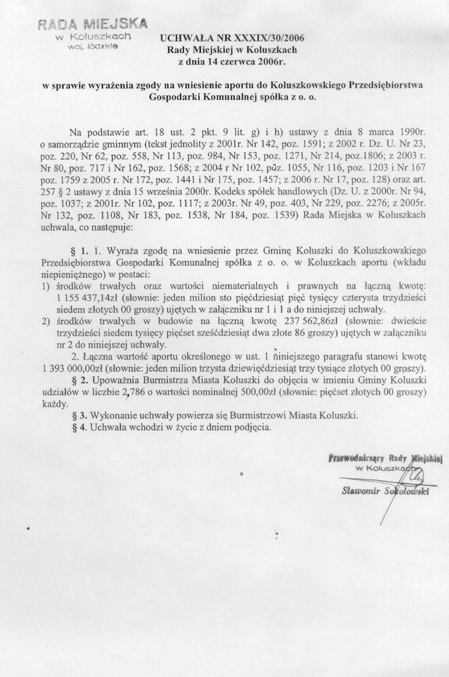 w sprawie wyra偶enia zgody na wniesienie aportu do Koluszkowskiego Przedsi臋biorstwa Gospodarki Komunalnej sp贸艂ka z o.o.