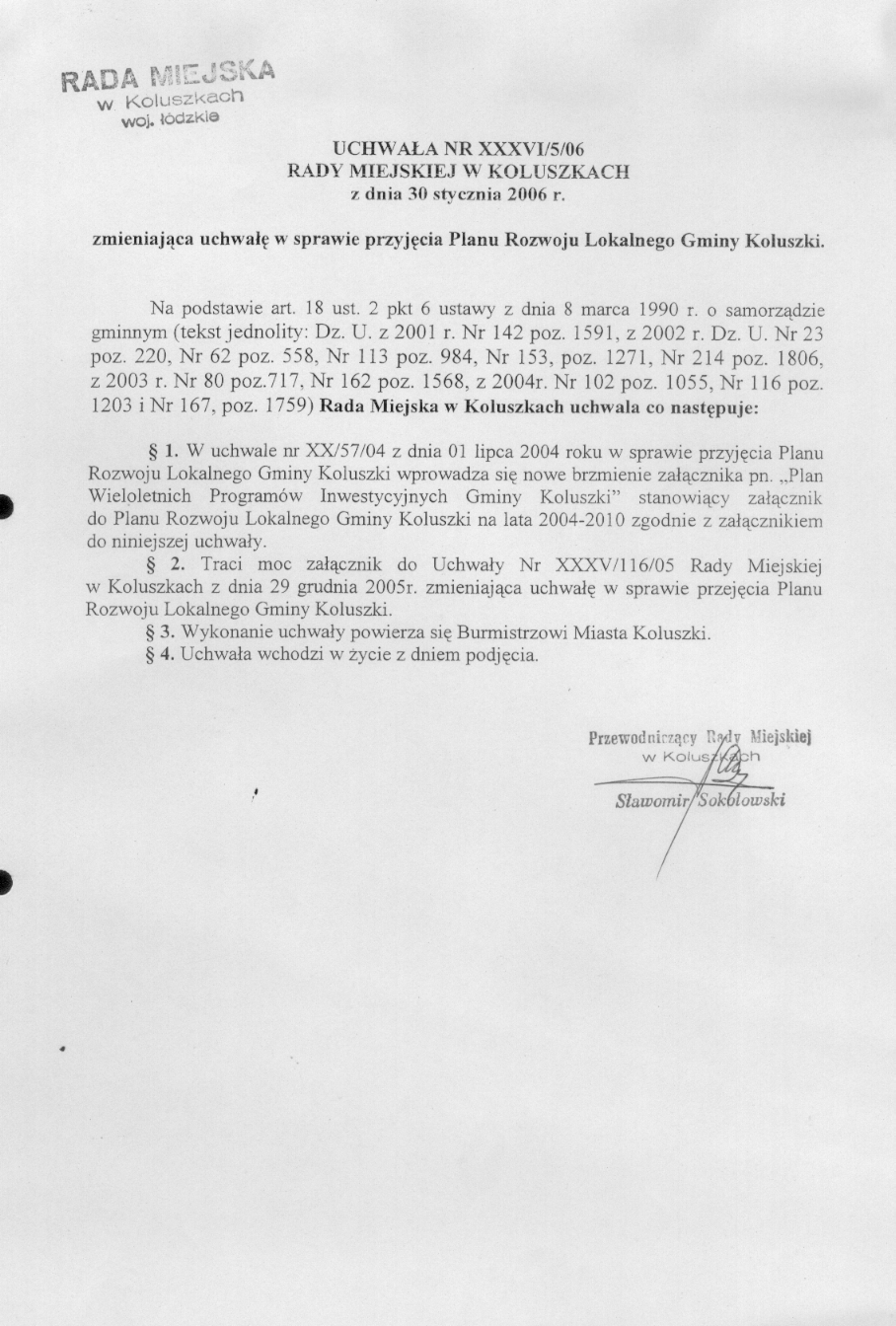 zmieniaj膮ca uchwa艂臋 w sprawie przyj臋cia Planu Rozwoju Lokalnego Gminy Koluszki.