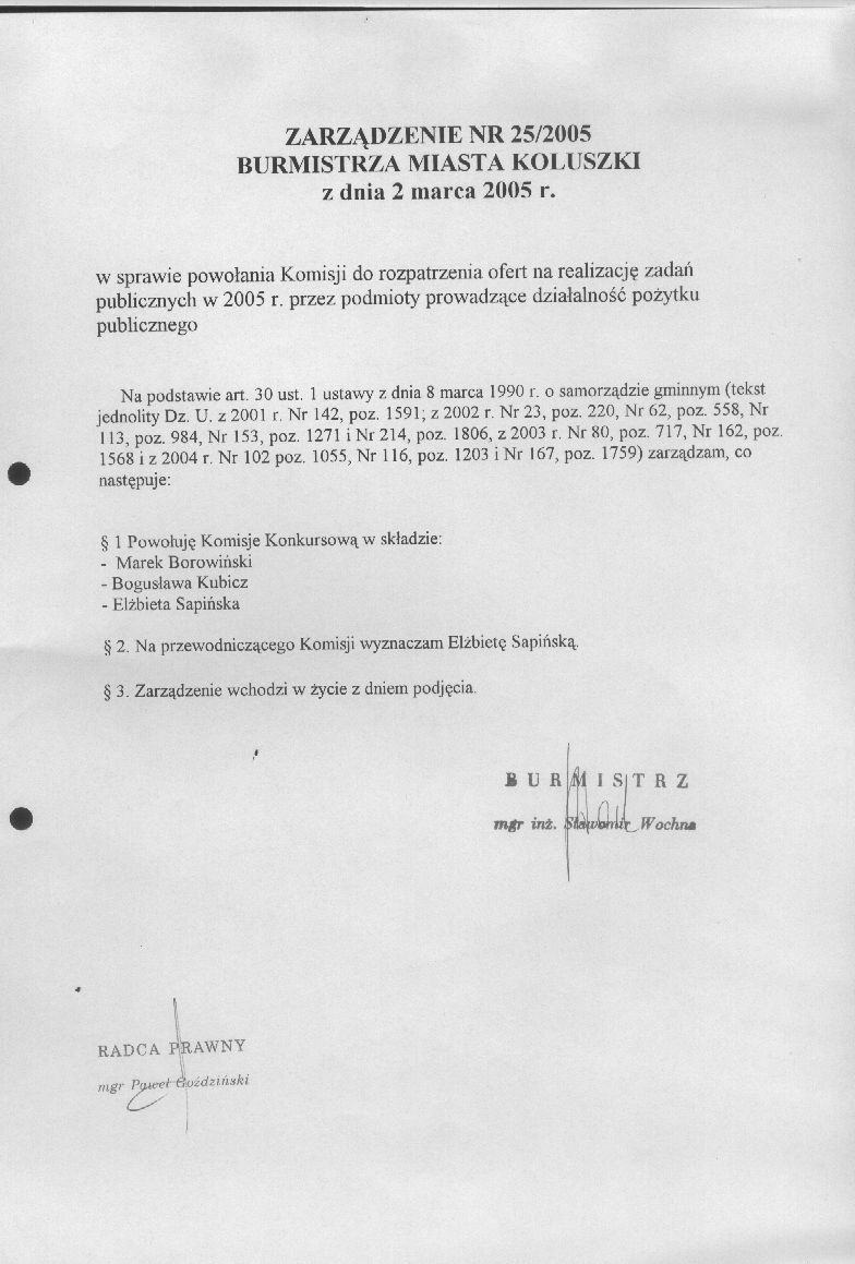 w sprawie powo艂ania Komisji do rozpatrzenia ofert na realizacj臋 zada艅 publicznych w 2005 r. przez podmioty prowadz膮ce dzia艂alno艣膰 po偶ytku publicznego