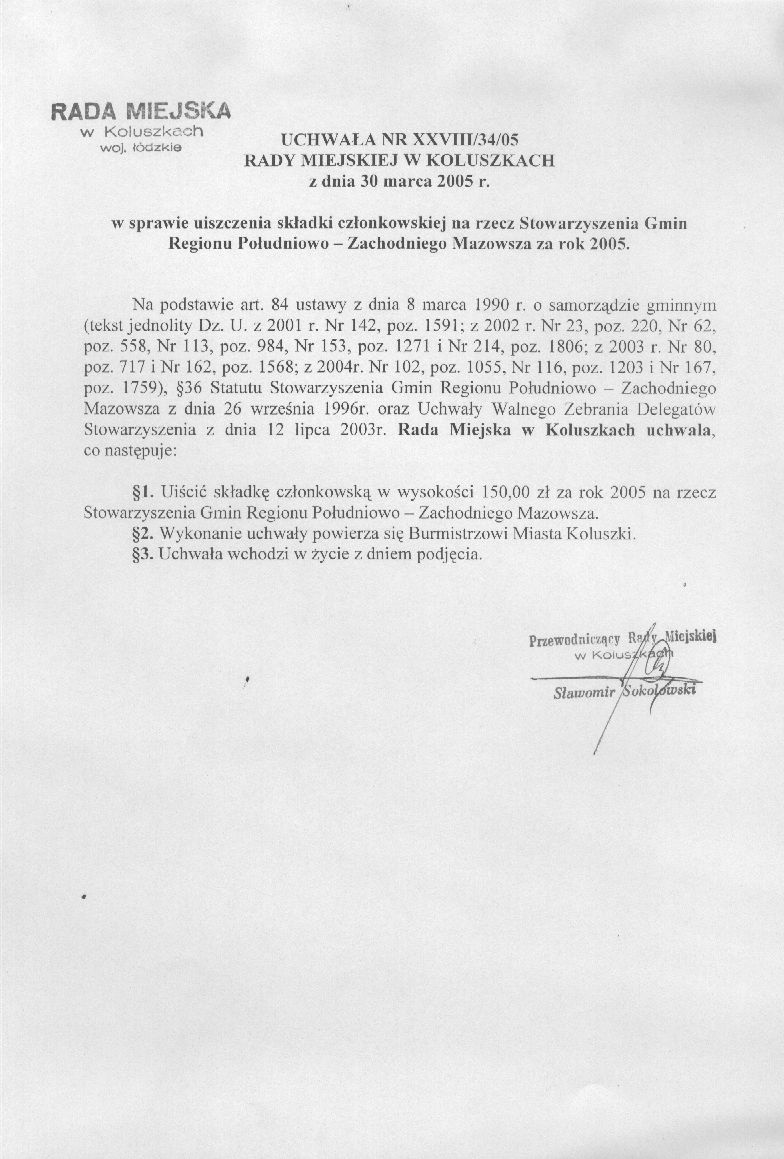 w sprawie uiszczenia sk艂adki cz艂onkowskiej na rzecz Stowarzyszenia Gmin Regionu Po艂udniowo-Zachodniego Mazowsza za rok 2005