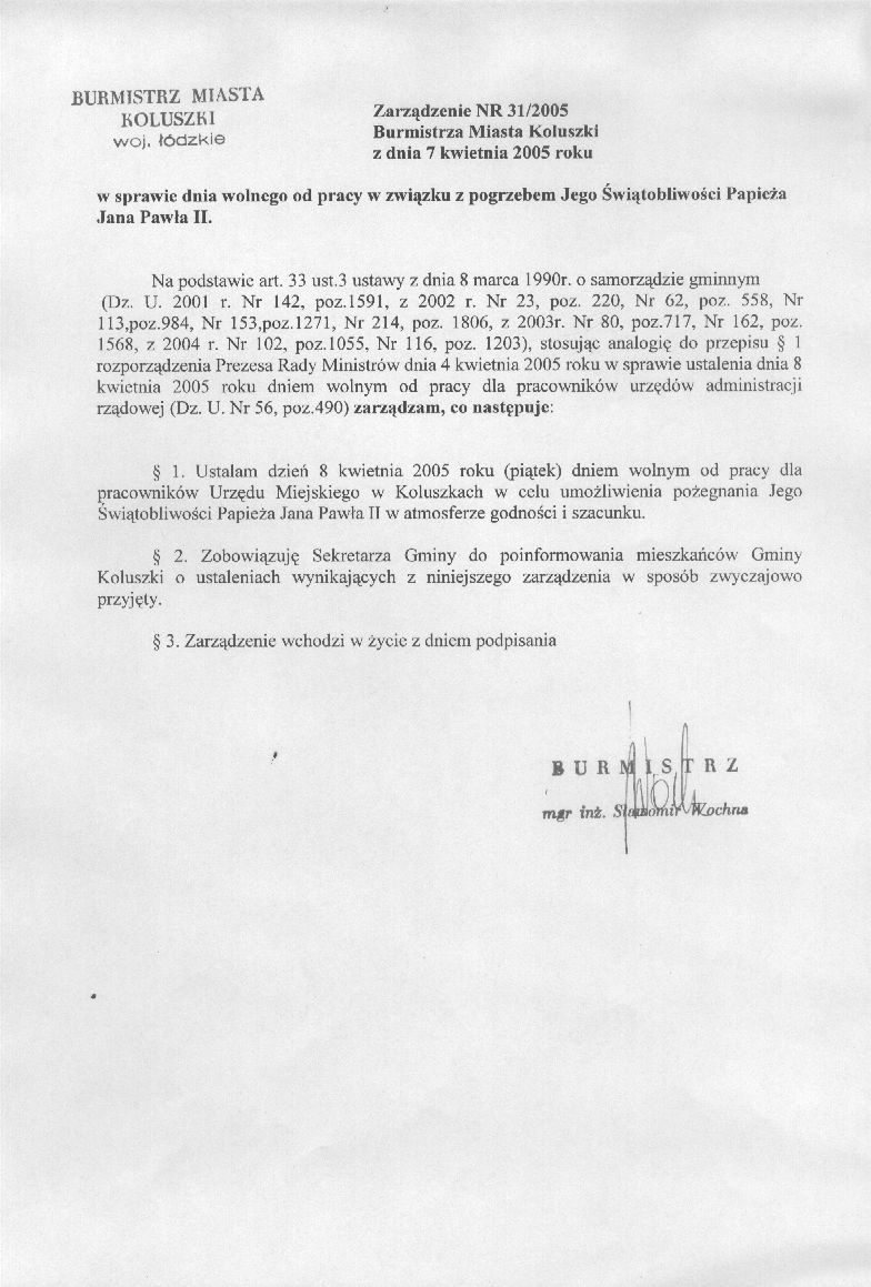 w sprawie dnia wolnego od pracy w zwi膮zku z pgrzebem Jego 艢wi膮tobliwo艣ci Papie偶a Jana Paw艂a II