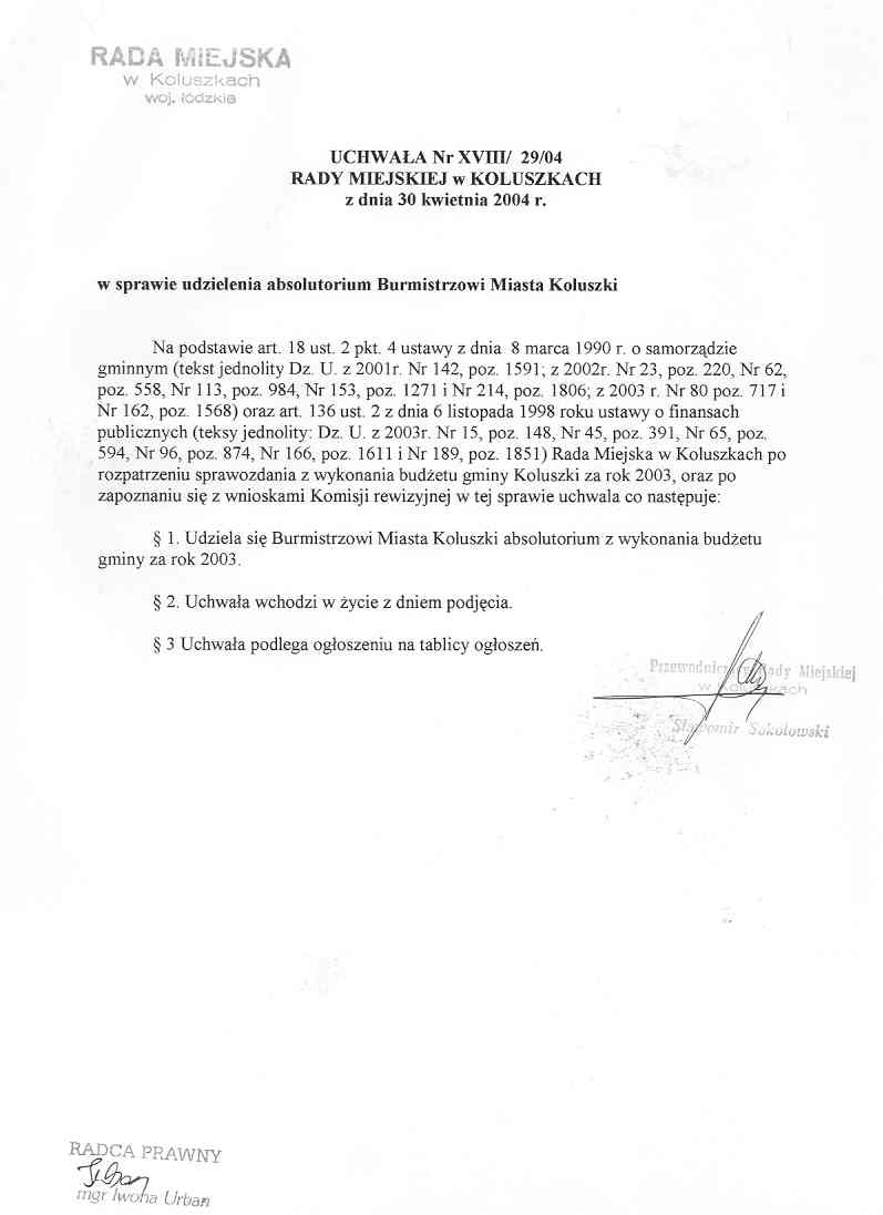Uchwa艂a w sprawie udzielenia absolutorium Burmistrzowi Miasta Koluszki