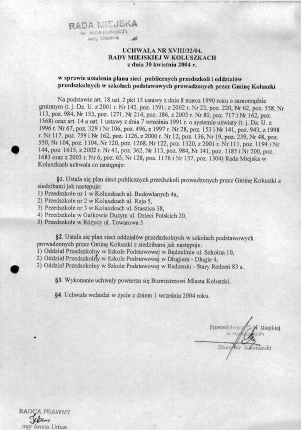 Uchwa艂a Rady Miejskiej w Koluszkach w sprawie ustalenia sieci publicznych przedszkoli i oddzia艂贸w przedszkolnych w szko艂ach podstawowych prowadzonych przez Gmin臋 Koluszki