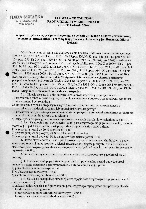 Uchwa艂a Rady Miejskiej w sprawie op艂at za zaj臋cie pasa drogowego na cele nie zwi膮zane z budow膮, przebudow膮, remontem, utrzymaniem i ochron膮 dr贸g, dla kt贸rych zarz膮dc膮 jest Burmistrz Miasta Koluszki