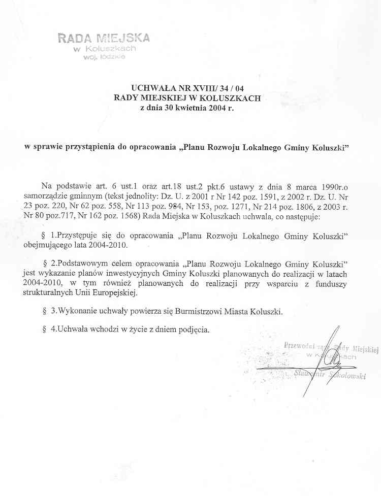 Uchwa艂a Rady Miejskiej w sprawie przyst膮pienia do opracowania "Planu Rozwoju Lokalnego Gminy Koluszki"