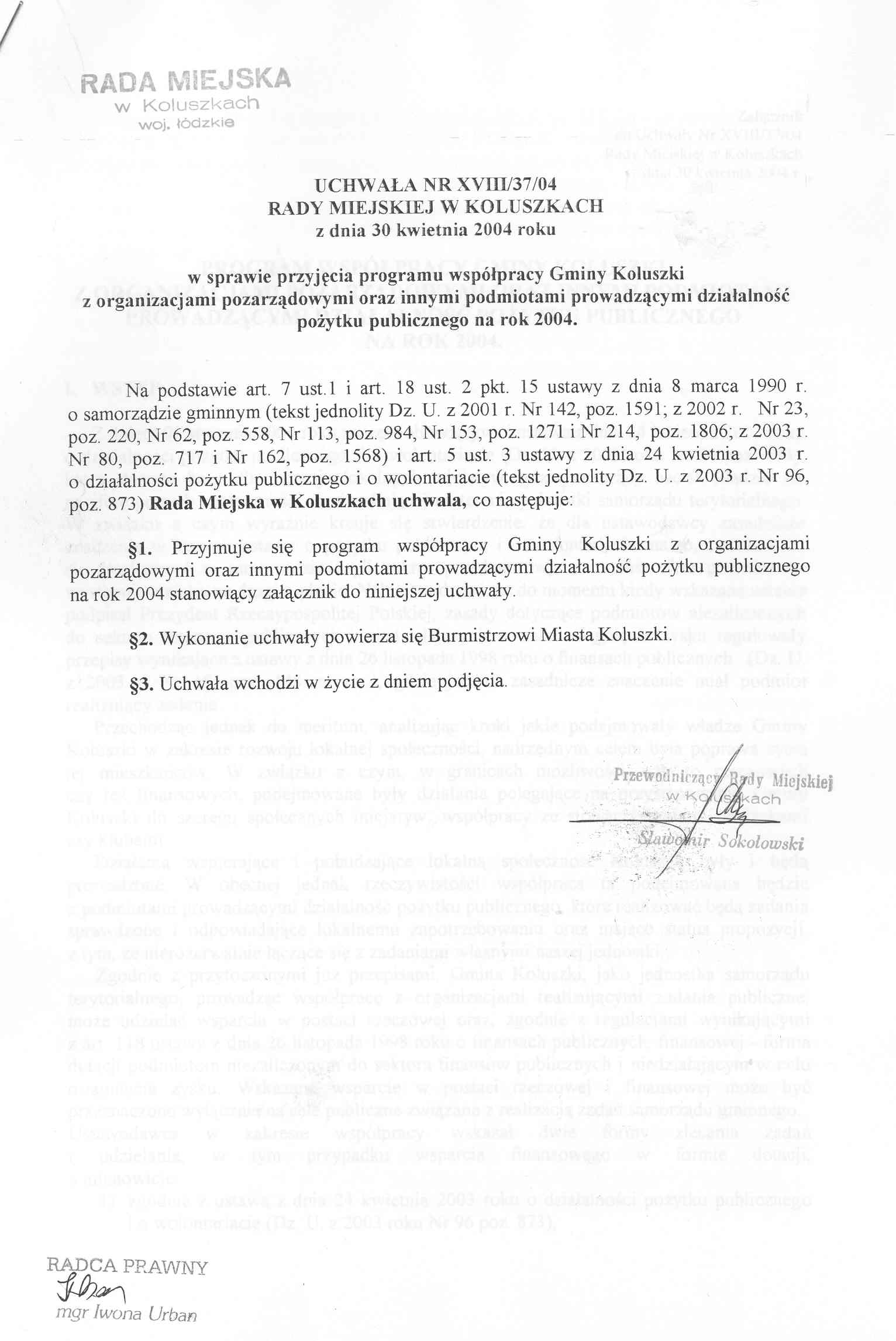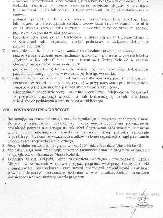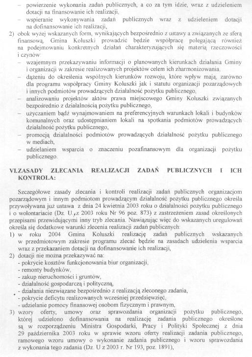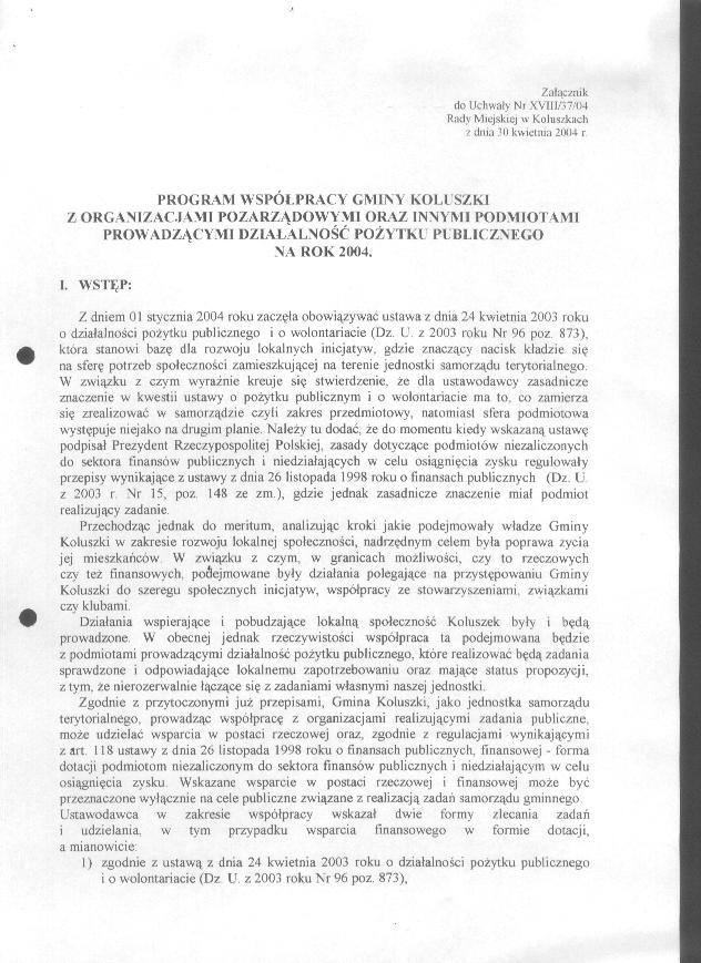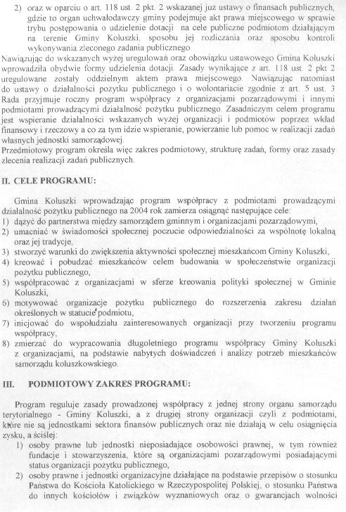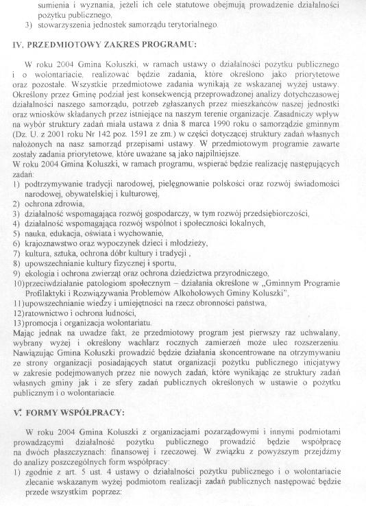 Uchwa艂a Rady Miejskiej w sprawie przyj臋cia programu wsp贸艂pracy Gminy Koluszki z organizacjami pozarz膮dowymi oraz innymi podmiotami prowadz膮cymi dzia艂alno艣膰 po偶ytku publicznego na rok 2004