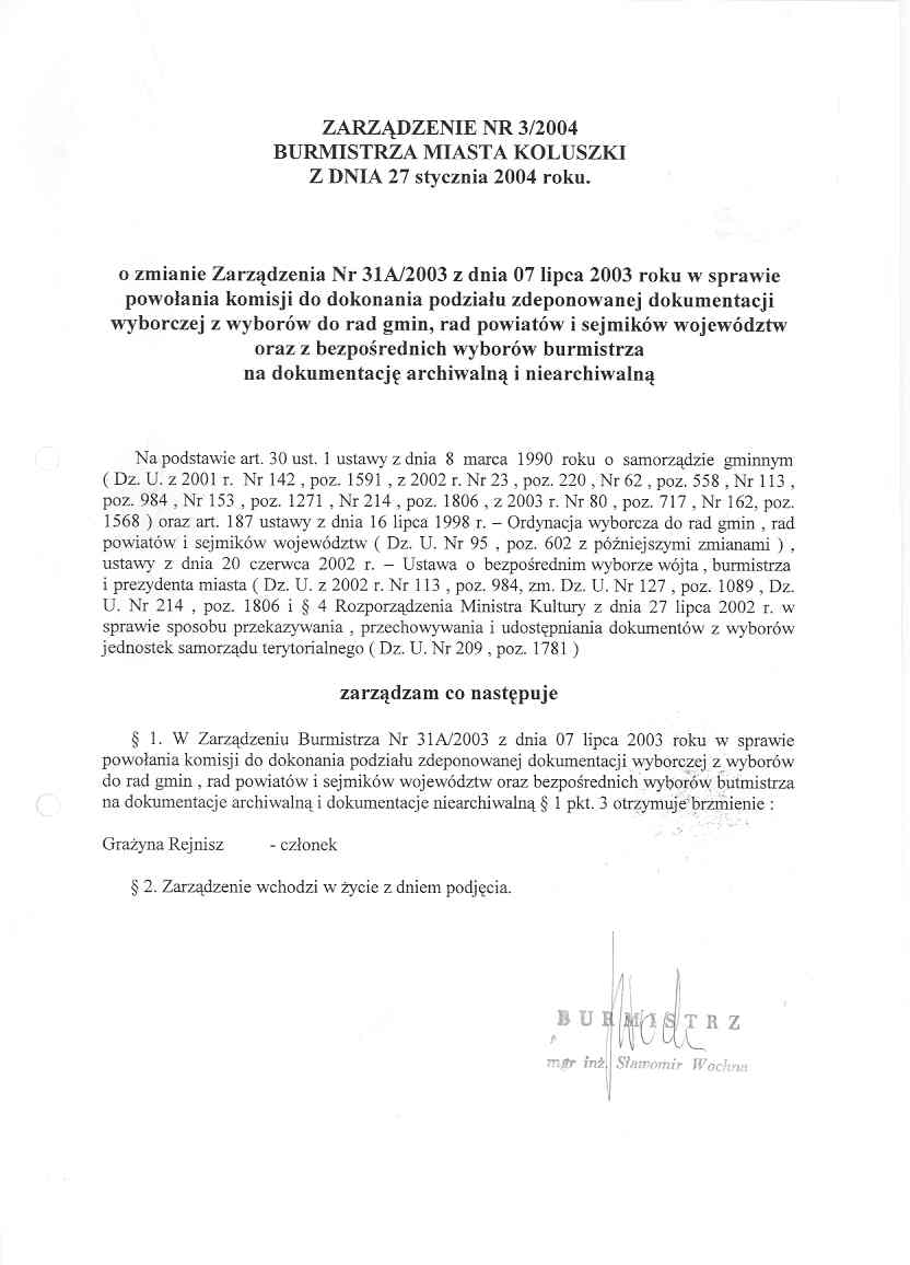 o zmianie Zarz膮dzenia Nr 31A/2003 z dnia 7 lipca 2003 roku w sprawie powo艂ania komisji do dokonania podzia艂u zdeponowanej dokumentacji wyborczej z wybor贸w do rad gmin, rad powiat贸w i sejmik贸w wojew贸dztw oraz bezposrednich wybor贸w burmistrza na dokumentacj