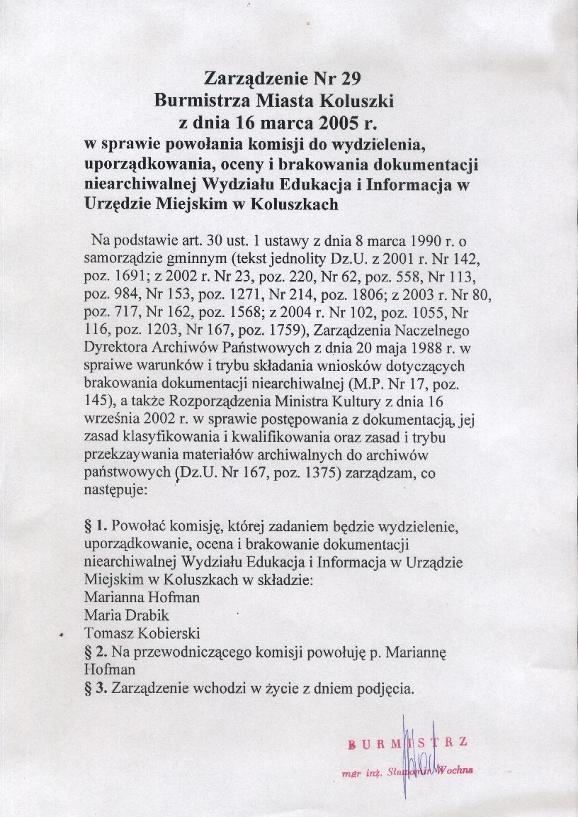w sprawie powo艂ania komisji do wydzielenia, uporz膮dkowania, oceny i brakowania dokumentacji niearchiwalnej Wydzia艂u Edukacji i Informacja w Urz臋dzie Miejskim w Koluszkach