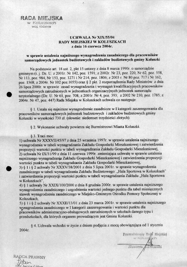 Uchwa艂a w sprawie ustalenia najni偶szego wynagrodzenia zasadniczego dla pracownik贸w samorz膮dowych jednostek bud偶etowych i zak艂ad贸w bud偶etowych gminy Koluszki