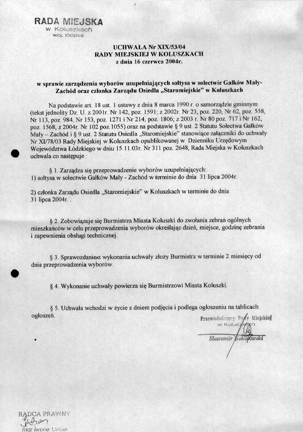 Uchwa艂a w srawie zarz膮dzenia wybor贸w uzupe艂niaj膮cych so艂tysa w so艂ectwie Ga艂k贸w Ma艂y-Zach贸d oraz cz艂onka Zarz膮du Osiedla