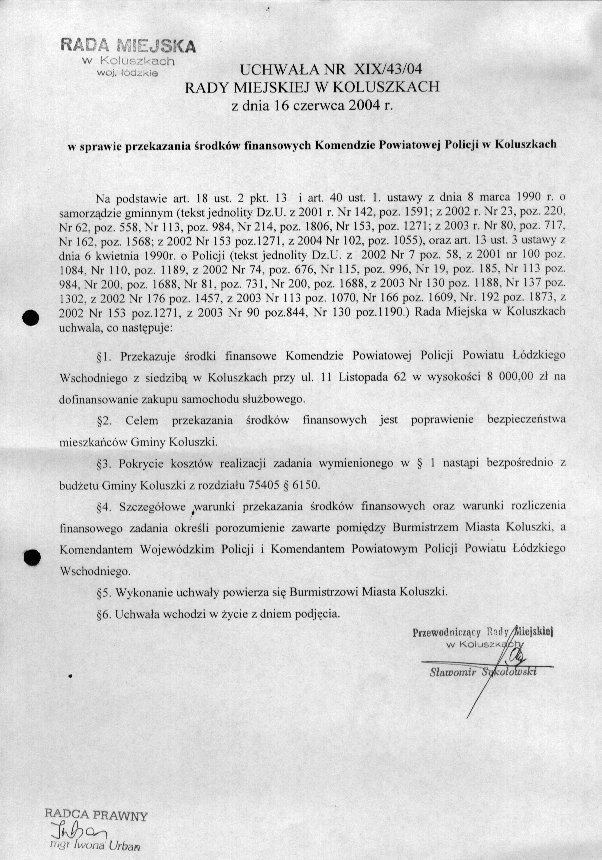 Uchwa艂a w sprawie przekazania 艣rodk贸w finansowych Komendzie Powiatowej Policji w Koluszkach